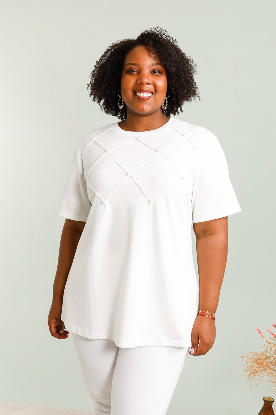 Mit einer Länge von 80 cm bietet das T-Shirt perfekte Abdeckung und sitzt locker und komfortabel. Der großzügige Schnitt schmeichelt der Figur und ermöglicht uneingeschränkte Bewegungsfreiheit. Die kurzen Ärmel und der klassische Rundhalsausschnitt schaffen eine zeitlose Silhouette, die sich vielseitig kombinieren lässt – ob mit Jeans für einen entspannten Look, mit eleganten Hosen fürs Büro oder unter Blazern für besondere Anlässe. Das pflegeleichte Material ist maschinenwaschbar und behält auch nach vielen Wäschen seine Farbe, Form und die schönen Perlen-Details. Erhältlich in verschiedenen Farben wird dieses elegante Plussize T-Shirt mit seinen besonderen Details schnell zu deinem Lieblingsstück.