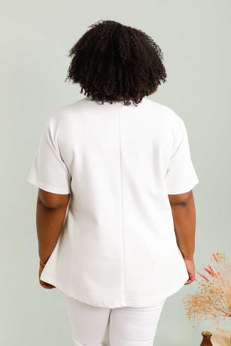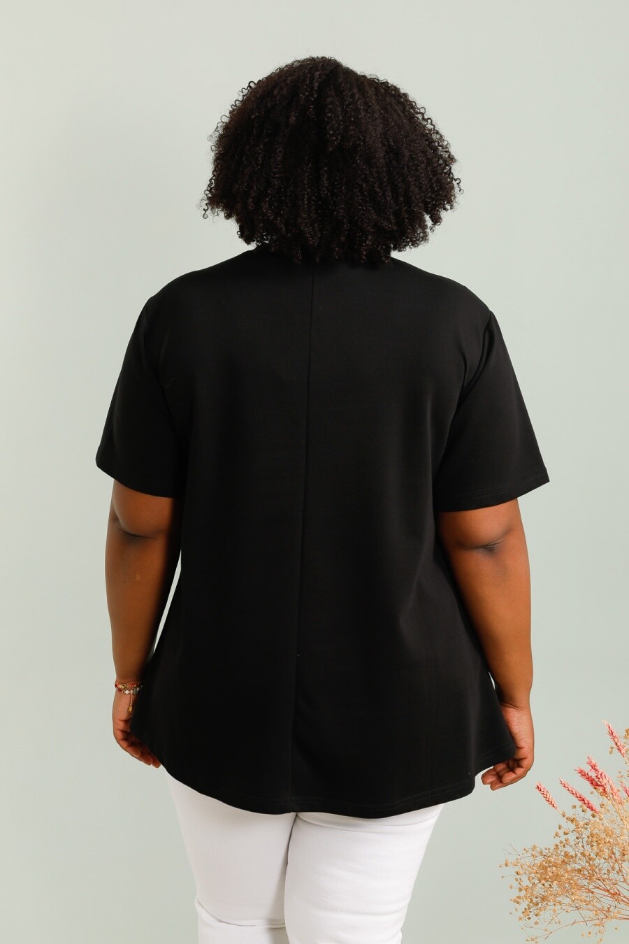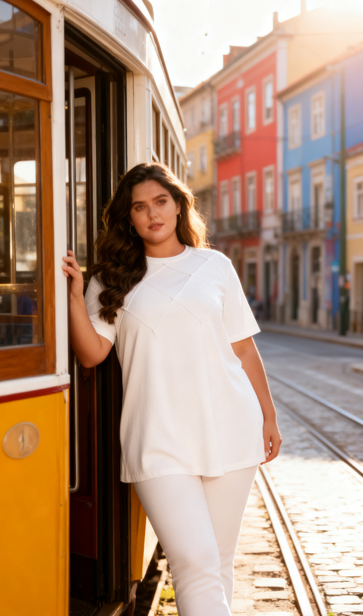 Die großzügige Passform wurde speziell für Plussize konzipiert und bietet optimalen Tragekomfort ohne einzuengen. Das Model ist 175 cm groß und trägt Größe T3 (46-48) mit einem Brustumfang von 124 cm. Mit einer Länge von 80 cm bietet das T-Shirt perfekte Abdeckung und einen komfortablen Sitz. Der lockere Schnitt schmeichelt der Figur, während die kurzen Ärmel für eine feminine Silhouette sorgen. Das T-Shirt sitzt an allen richtigen Stellen locker und bequem und ermöglicht uneingeschränkte Bewegungsfreiheit.