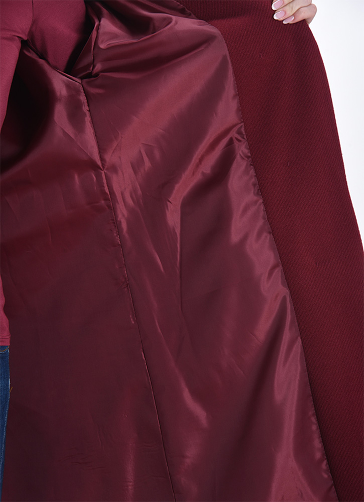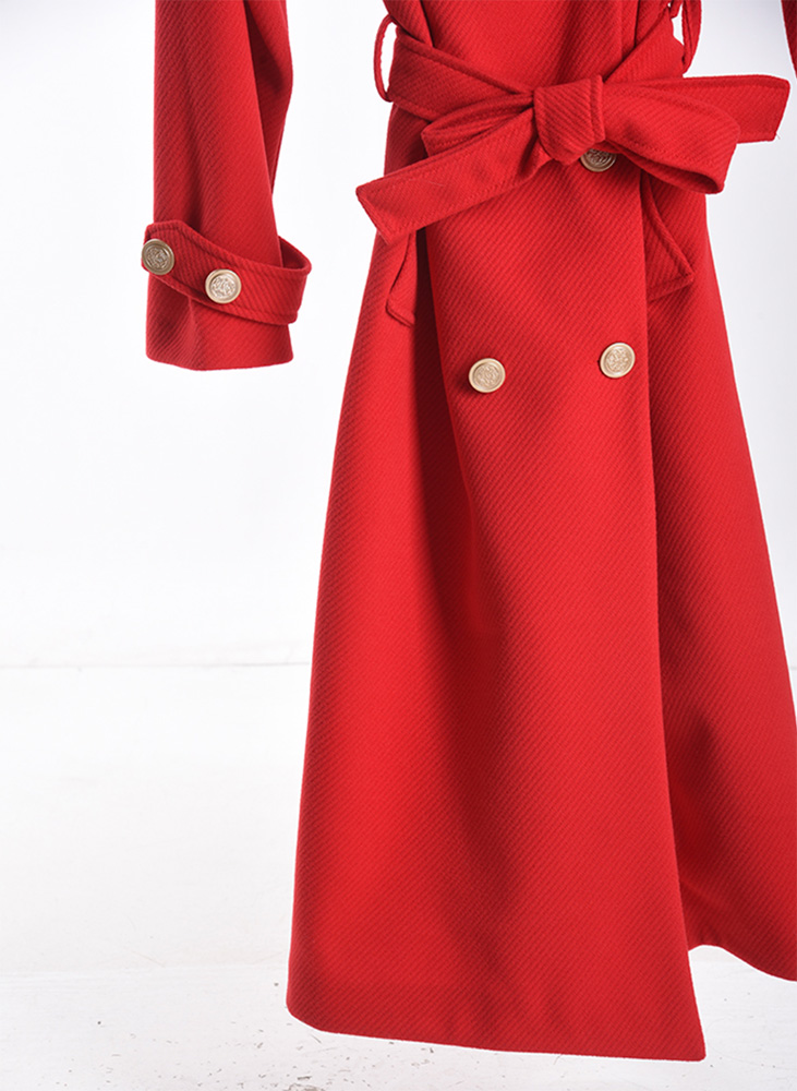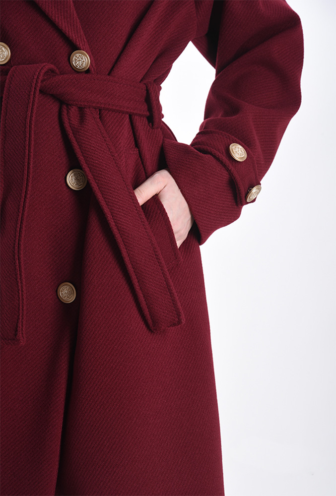 Klassische, feminine Passform mit leicht tailliertem Schnitt durch den Bindegürtel. Das Model ist 165 cm groß und trägt Größe 36. Der Mantel reicht bis über das Knie und bietet eine elegante Silhouette.